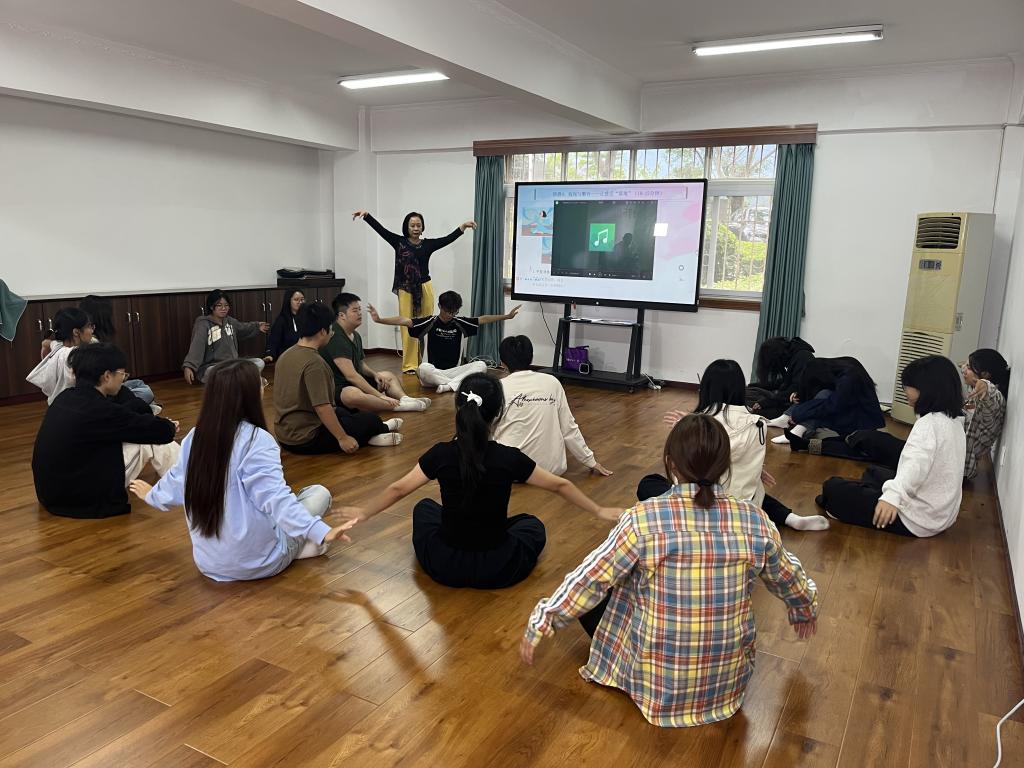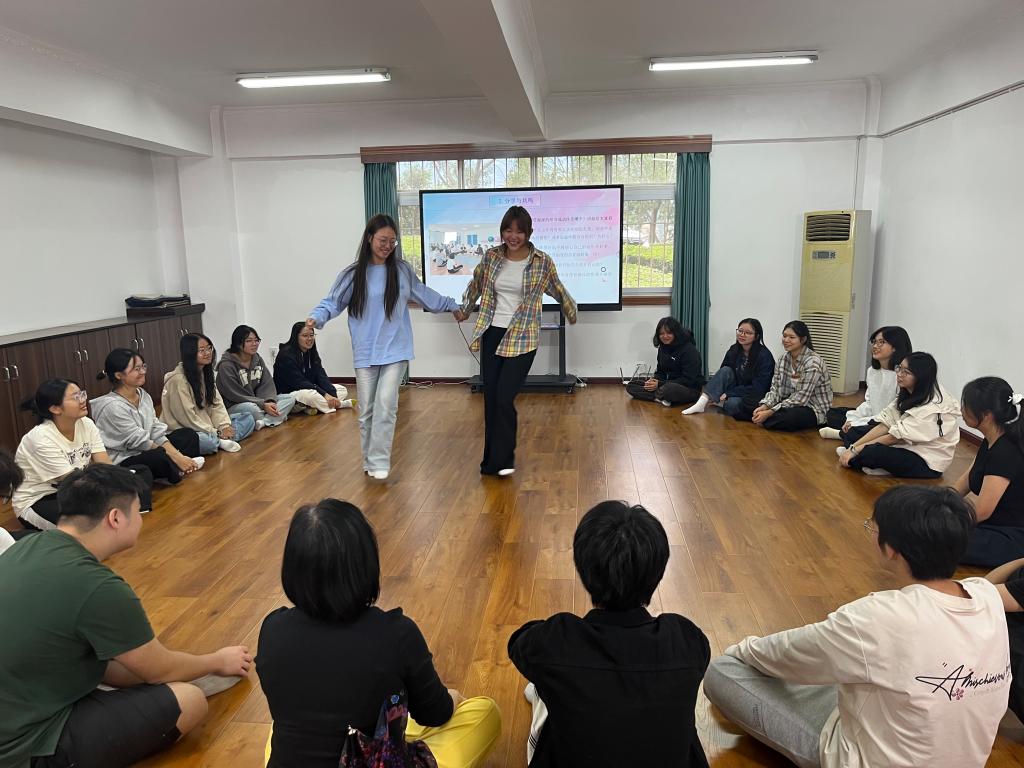 活动伊始,代俊老师与同学们共同建立团体契约,随后引导大家阐述自己对“舞动”的理解,老师也为大家讲解了“舞动”的内涵。紧接着,活动的主体环节分为四个阶段有序推进:在热身与安全感建立阶段,通过身体扫描、节奏唤醒、破冰互动等环节,同学们跟随指令从逐个部位唤醒身体,在舒缓节拍中舒展自我;还以“问好”“用手打招呼”、“抖肩膀”等非接触式动作进行破冰互动,建立非语言的安全感。主题探索与情感表达阶段,大家借缓慢拉伸动作释放身体紧绷感,把压力外化为动作尽情释放;其中小组“动作传递”环节更让参与者在互动中得到共鸣。整合与人际连接阶段,实现了从“个体表达”到“团体共鸣”的过渡;信任连接环节中,同学们通过动作分享交流,在协作中深化了归属感。收尾与整合阶段,老师播放着舒缓的音乐,同时引导大家通过“蝴蝶拍”等自我安抚动作,从动态表达中回归平静。