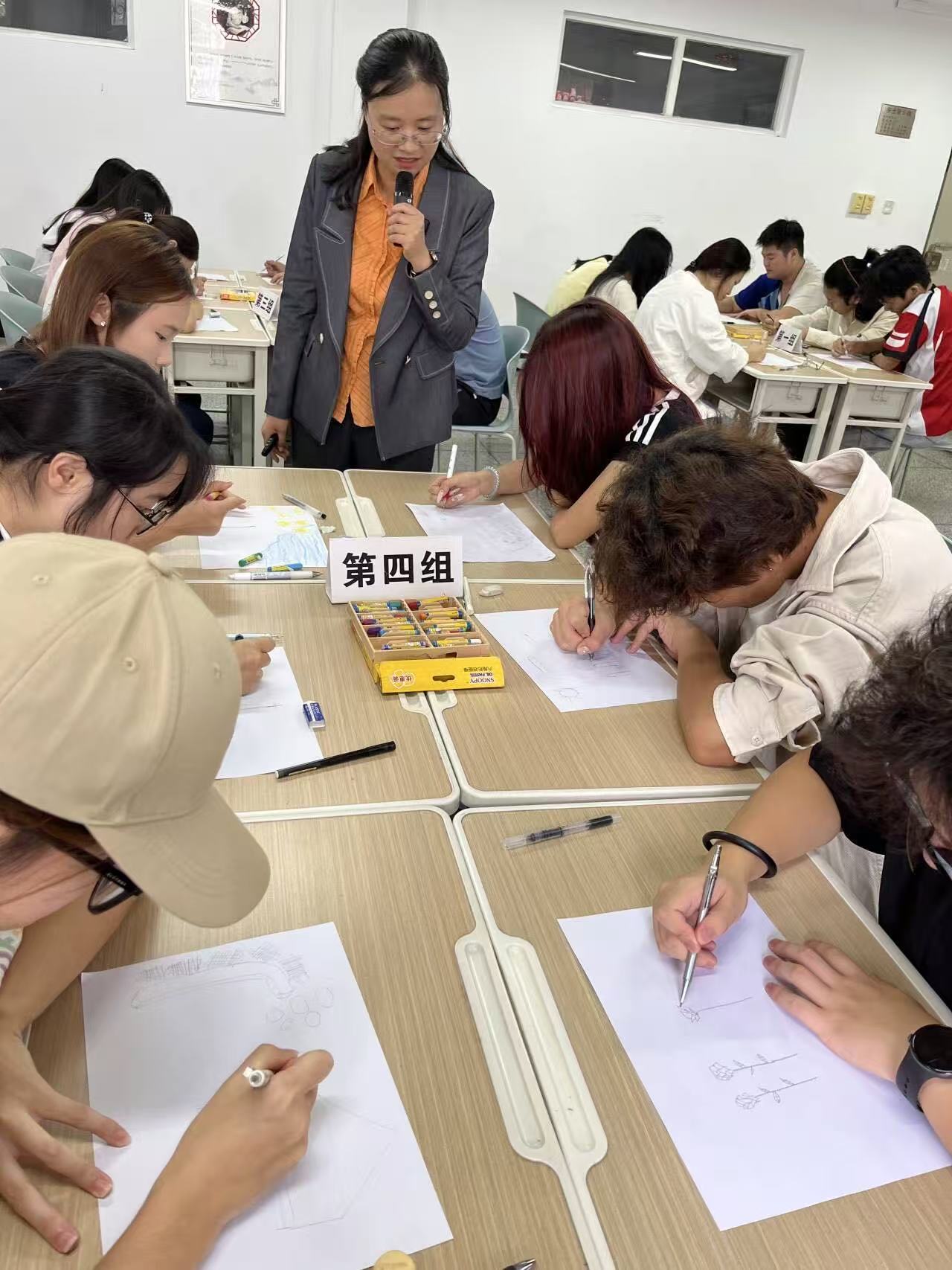 活动中,袁老师先阐释了“玫瑰花丛透视自我像”的核心内涵,明确自我意识包含自我认识、自我体验与自我控制三个心理成分,为后续环节做好了理论铺垫。随后,组织参与者轮流进行自我介绍,分享对自我的认知及希望做出改变的方向。针对分享内容,袁老师补充道:每个人都有优缺点,有时缺点又是一个人的特点,鼓励大家以包容心态接纳自我。随后,进入核心实践环节,袁老师引导大家跟随指导语想象并绘制自己的玫瑰花丛,接着袁老师列举了典型的自我意识偏差的绘画特征引导大家进行自我像分析,即过度自卑、过度自我认同和自我中心、苛求完美、矛盾自我。然后,大家结合自身情况分组探讨自我意识偏差的日常表现及调适方法,最后,各小组代表依次分享讨论结果。