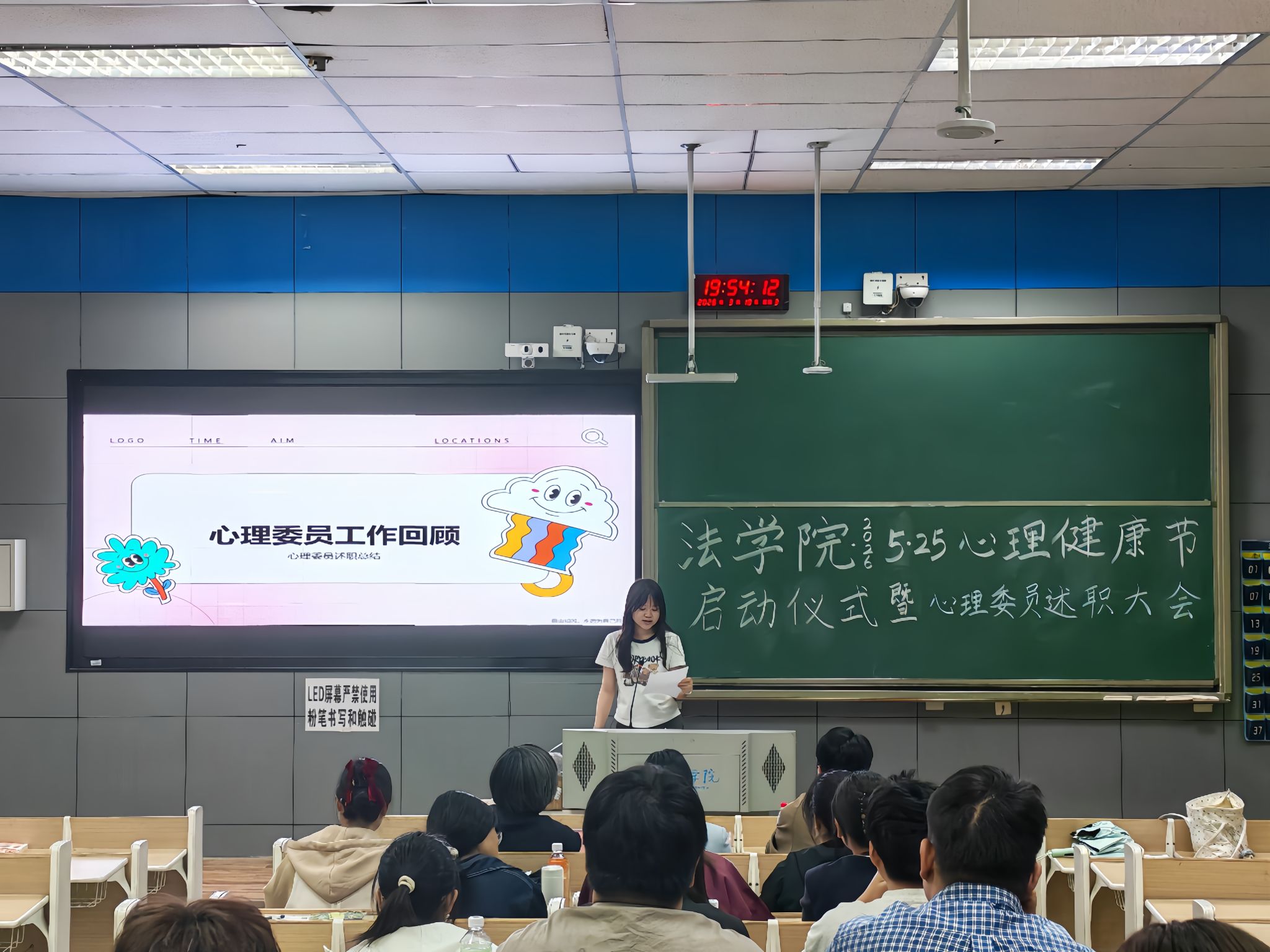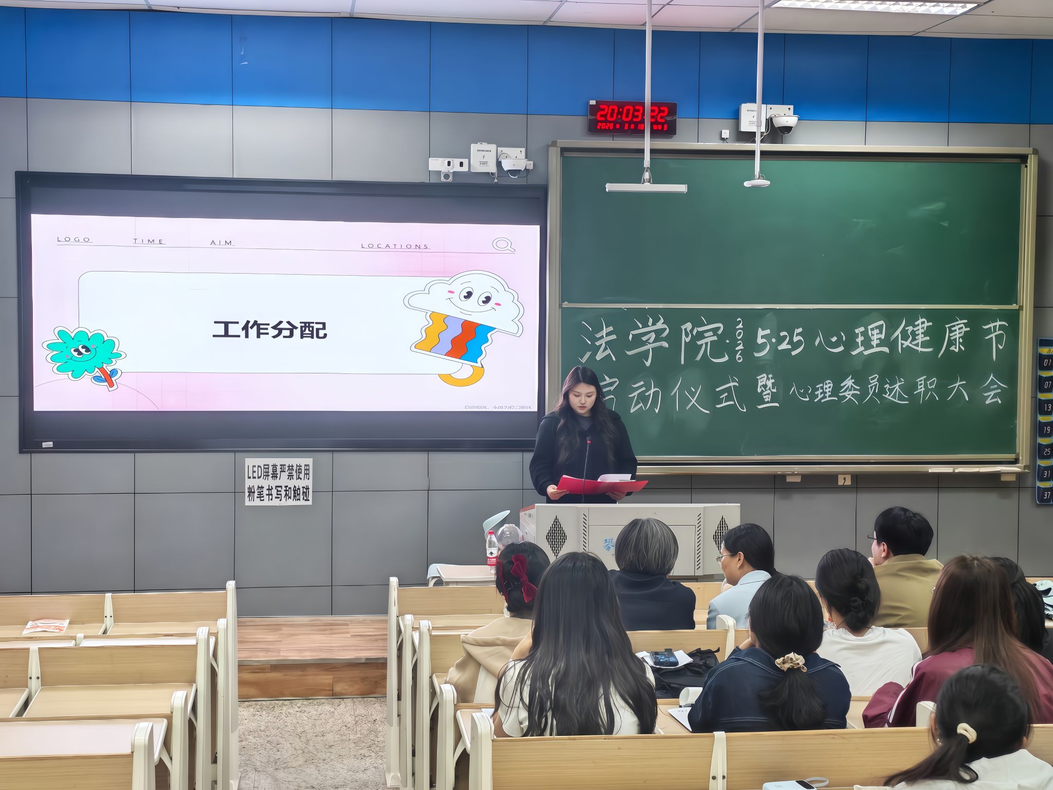 会议最后,心素部部长胡馨怡上台发言,全面解读法学院2026年5·25心理健康节系列活动安排。从主题讲座、团体辅导、主题征文等特色活动,到日常心理服务机制的优化完善,部长逐一明确工作规划与推进节点,同时对心素部成员及心理委员提出工作要求,确保系列活动高质量落地,切实为全院学生心理健康保驾护航。