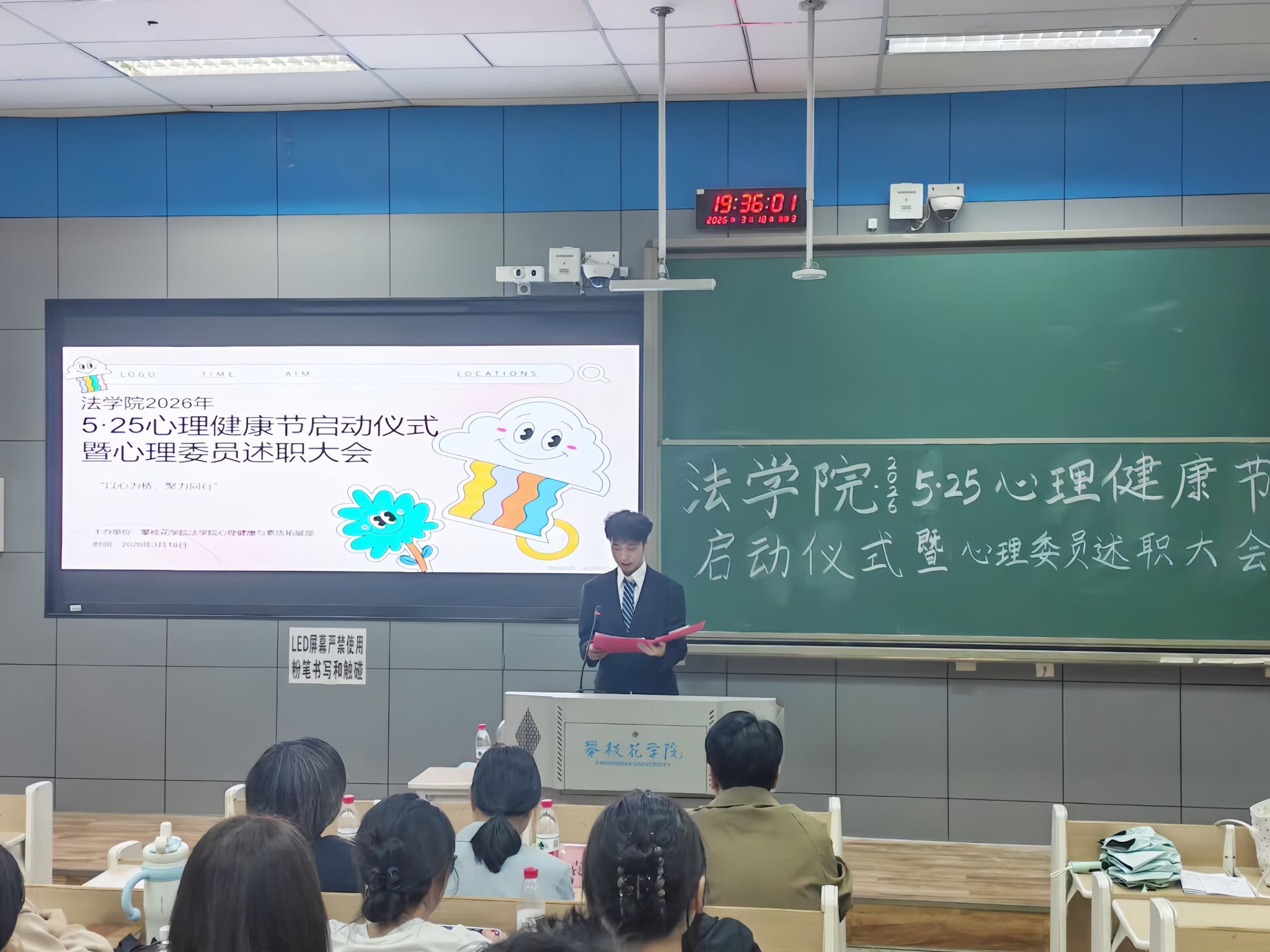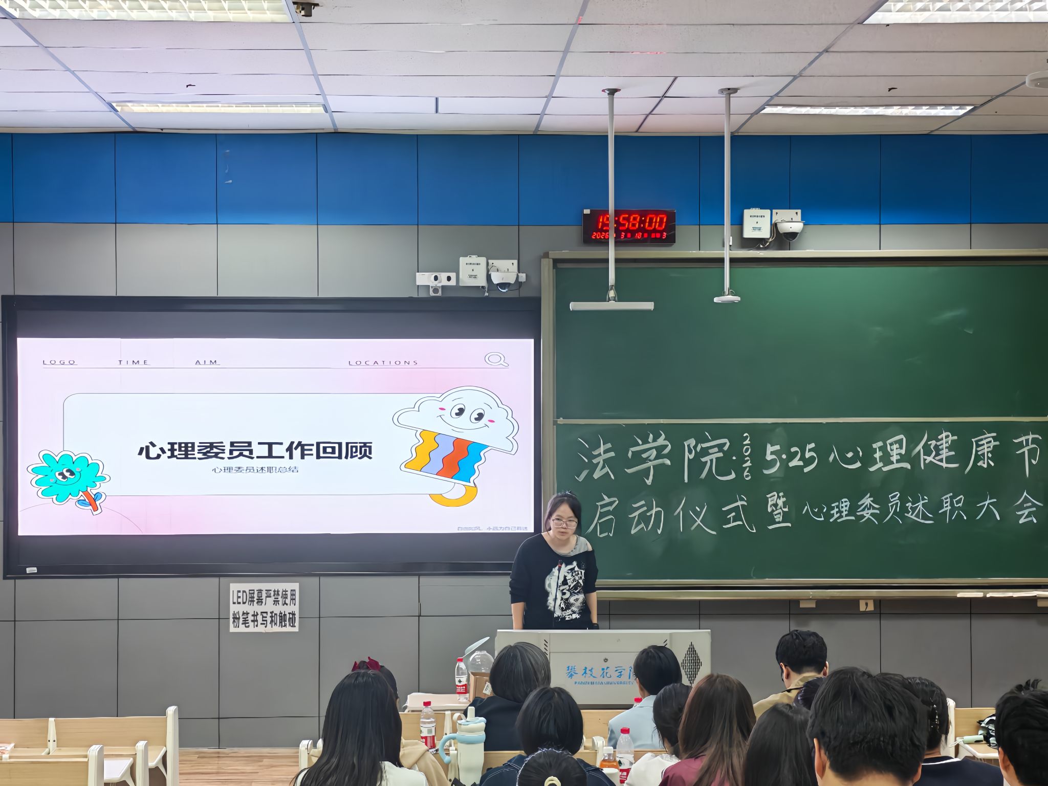 为进一步筑牢学院心理健康教育防线,梳理总结心理委员工作成果,系统部署心理健康节系列活动,3月18日晚7:40,法学院2026年5·25心理健康节启动仪式暨心理委员述职大会在志学楼1-101教室顺利举行。本次会议由心素部组织开展,攀枝花学院心理健康教育中心老师袁晓艳、法学院党委书记张琳、 法学院学生科科长兼分团委书记刘沙 ,心素部全体成员及各班心理委员参会。